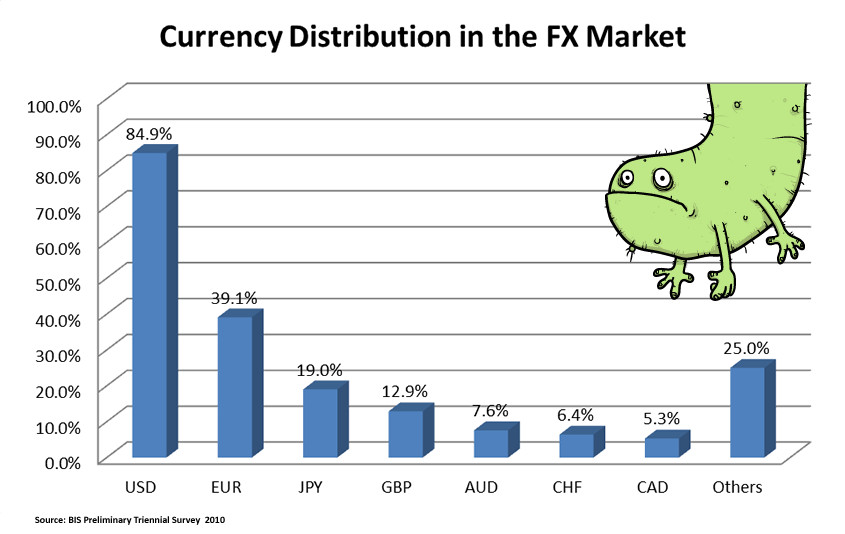 از آنجایی که در هر معامله فارکس دو ارز وجود دارد، مجموع درصد سهم ارزها به‌جای ۱۰۰٪، به ۲۰۰٪ می‌رسد.